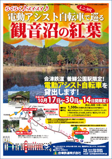 会津鉄道では、平成23年10月17日(月)~10月30日(日)までの14日間限定で養鱒公園駅限定、電動アシスト自転車をレンタルいたします。 紅葉の時期にあわせた期間限定の貸し出しです。