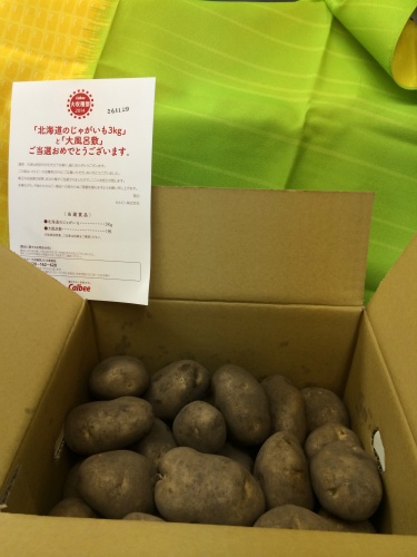 カルビ大収穫祭2014に当選しましたポテトチップスにも使われている【トヨシロ】と言う品種のじゃがいもだそうです産地は北海道の更別村と言う所だそうです丸々としていて美味しそうなじゃがいもが3キロ!!職場のみんなにお福分けしました風呂敷はとうもろしきが届きましたじゃがりことポテトチップが大好きな息子が食べたバーコードでの当選です(笑)
