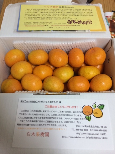 懸賞ではありませんが。。。昨日イオンで『三重県フェア』と言う催しをしていましたアンケートに答えるとガラガラ抽選会に参加出来ると言うので早速答えてガラガラ挑戦ですわ~い無欲の勝利かみかんが当たりました三重県、南伊勢町マルゴのみかんだそうです初めて知りましたがさわやかな酸味で美味しく頂きました数日前楽天でみかんが当たり旦那さんのお母さんからみかんを送って貰いそして昨日!!みかんの当たり年ですみかんを食べてビタミンCを補給して肌が美しくならないかなぁ。。。風邪予防になりそうです