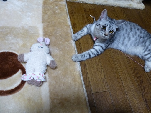 ありゃ・・・ミャーコさん、どうしたんですか?うさぎさんのパンツなんか脱がしちゃって~ハイ、ちゃんと履かせといたよ。うさこさんのトドメ刺しですか?なんか、スリスリと仲良くしてるようにも見えるけど・・・なんかやっぱりイマイチ、ノラないみたいだけどぉ~ああ、ねずみのおもちゃの糸が足に絡みついてるのね。たまにこういうこともあるけど、器用にほどいてます。わんことにゃんこ、どっちも可愛いけど、ニャンコは面白さがある。