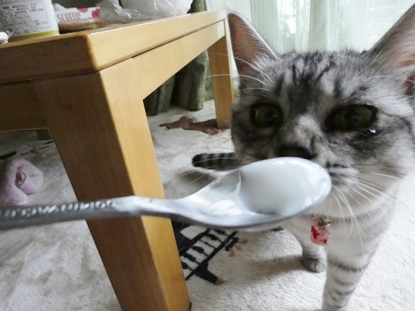 ミャーコぉ~ヨーグルト、食べる?(食べないのわかってるけど、やってみる)あ。ちょっと舐めた・・・どう?おいしい?なぁに?そのへんな口・・・ヘンなもん、食べさせやがって~!あれ?不味かった・・・?遠慮せずにもっと食べてみぃ?あまりヨーグルトはお好きじゃないようでした・・・ちょびは大好きだったのにねぇ~~2009年、ちょびお星さまになる3年前でした(13歳)懐かしいねぇ~~~
