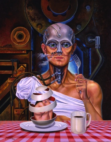 地下鉄サリン事件から今日で17年になる。一方、マインドコントロールということばが、またもやマスメディアをにぎわしている。 私はかつてサンリオSF文庫で『着飾った捕食者』の装丁画を描いた。このときにイメージの元にあったのがオーム真理教であり、マインドコントロールということであった。その原画は、後にもっと大きなサイズ(117x97cm)に描きなおした。きょうはその作品を掲載することにした。山田維史『日々の営み』油彩Tadami Yamada "Daily Doings" Oil on Canvas