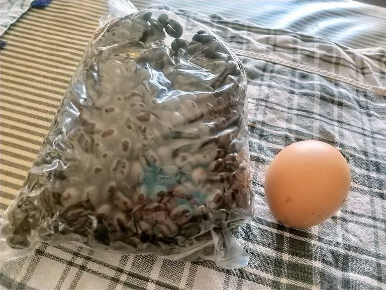 生豆から焙煎した挽きたて珈琲豆と産んだ日を記した卵六個