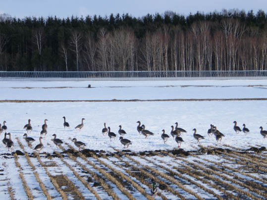 大空町の国道脇です!!雪が融けた水田で去年の落穂拾いだと思うけど、鴨が群れていました!例年だと白鳥なんですが今日は鴨です(笑)車を止めただけで警戒して移動しています!飛来した新たな群れも警戒してかなり離れたところから様子を伺ってました!静かに車を降りてみたら・・・・・やっぱり飛んでしまった~~(爆)白鳥公園と違って人馴れしてないからな~~!!