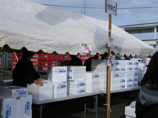 さすが牡蠣祭りだね~、ホタテも売ってるのに全然売れてません(笑)声をからしての呼び込みにも殆ど見向きもしていない!売場の前のたくさんの人たちは・・・買った牡蠣を送るのに順番待ちしていました!こんなにたくさん送り状書くだけでも一仕事だと思ったら・・・要領のいい人は書きあがった送り状の束を既に持って並んでいました(爆)ここに並んで送るのが良いのか?空いている郵便局まで運んで送るのが良いのか?並ぶの嫌いな私なら運んじゃうな~~(笑)