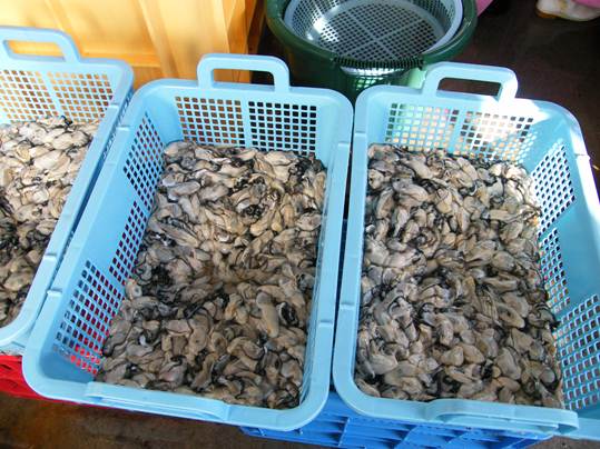 隣の部屋には殺菌された剥き牡蠣がどっさりと!この後袋詰めされるんですね。などと話しながらのんびり写真を撮ってた私の手にいきなり牡蠣が飛んできた~~スーパーで売ってる牡蠣は食べれないけどこれは別物!!メチャ美味いです~♪
