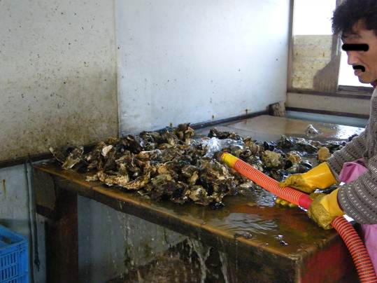 牡蠣祭りで買えなかったからといってそのまま帰るのは辛すぎる!したひろネットワークを展開して辿りついたのは・・・今朝揚げて来た牡蠣を選別している漁師さんの作業場横で見ていると何とも手早い事!!ひと山何キロ有るのか解らないけどあっという間に無くなっていきます!!その横では剥き牡蠣用に選別されたのを奥さんが・・・これも手早い♪やりたくてムズムズする私ですが絶対足手まといになるからぐっと我慢の見学者です!
