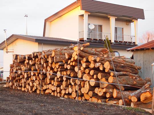 これが始まりの丸太の山・・・2か月弱の昨日切り終わり・・・!次はこれを割って・・・!積み上げる・・・!高さは約2メートル。昭和7年生まれの元気な母です♪
