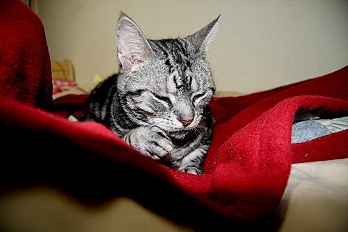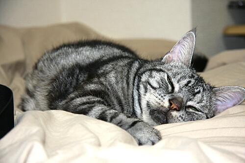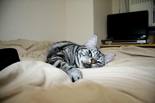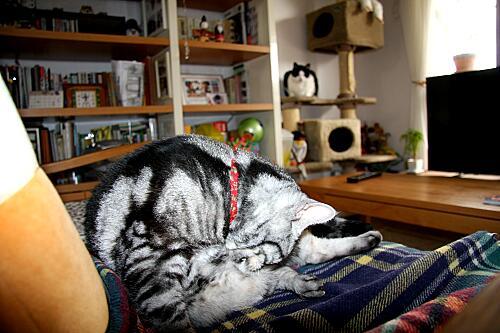 朝、にゃんこたちのご飯の用意とトイレの後始末。そして私の朝食をすませて1回目の散歩にでます。帰って来て、もう1度にゃんこトイレを確認してから、ようやくPCいぢり。ブログの更新の時間。これがだいたい5時半ごろ(なんせ毎朝4時前後にはチャッピくんが起こしてくれるので)と、決まってこのひとがやって来るんですな。チャッピくん。PCいぢってたら、このごろ決まってやってくれます。私の膝を手で引っ掻くの。痛い!無視すると、何度でも。今冬、お決まりのパターン。仕方ないからPCを一旦置いておいて、ベッドに移動したら、チャッピくんもベッドに飛び乗り。私が横になるのを確認して、ふところ近くに場所どり。ここから毎日の儀式が始まります。私の右手をチャッピくんの両手で上下に挟むようにかかえて、それからチャッピくんは自分の頭を私の右手の甲に乗せる。それで寝てしまうんです。手を抜こうとしても、ガッチリ両手でかかえられてて抜けやしない。しかたないから、暫らくお付き合いで添い寝と云うのがこのごろの日課となってます。中之島公園の猫たち-SAVE THE CATS IN NAKANOSHIMA PARK-」整備工事で閉鎖になった大阪の中之島公園。そこに暮らしてた約70匹の子供たち。心あるボランティアのご尽力で「猫の部屋」と呼ばれる仮住まいを得ることができました。すこしずつ里親さまも決まってきてますが、まだまだ多くの子供たちが良いご縁を心待ちにしています。なを「中之島公園の猫たち」では恐縮ですが現金によるご支援は一切お断りしております。「公園ねこ適正管理推進サポーター制度」が実施されています。そちらのリンクもありますので、大阪市在住の方はぜひ見てください。動物と人間との共生・動物の地位向上を目指し活動を続ける保護団体を応援するための「にゃんわんプロジェクト」が立ちあがっております。バナーの貼り付けなど、ご協力いただければ嬉しいです。