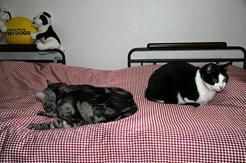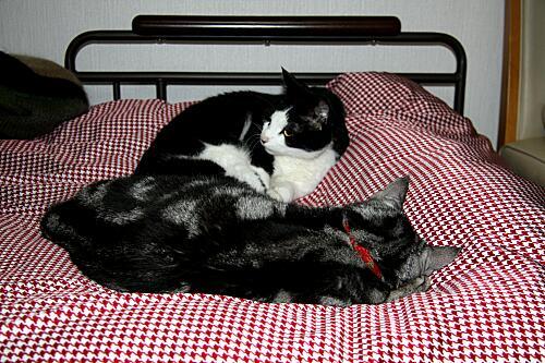 にゃんこ多頭飼いのお宅ではよくある光景でも、我が家では先ず見れないこと。険悪な仲のチャッピくんとミミちゃんが一緒に寝てる!これはヨメ・ベッドの上。お風呂場のリフォームで職人さんの邪魔になってはと、昼間はヨメの部屋にふたり入れてたらこの始末。ミミちゃんは普段枕もとに寝るのに、チャッピくんがヨメの部屋に入ると足元に移動。チャッピくんが足元に寝ることあるので、それを阻止せんがため。しかし、そんなことに頓着ないチャッピくんのこと。ミミちゃんがいても、構わずヨメ・ベッドに登って寝てしまったらしい。ミミちゃん、ぜんぜん寝れないねぇ。チャッピくんのことをめちゃ気にしてる~だったら自分が移動すればよいのに、それでは癪だ!チャッピくんは寝相がめちゃ悪いので、脚でミミちゃんをケリケリ。たまらなくなって...ミミちゃんはチャッピくんの脚をかじっていたよ(笑)いつもこんなだったらい~のにねぇ。まぁうちでは年に1回あるかないかの光景です。中之島公園の猫たち-SAVE THE CATS IN NAKANOSHIMA PARK-」整備工事で閉鎖になった大阪の中之島公園。そこに暮らしてた約70匹の子供たち。心あるボランティアのご尽力で「猫の部屋」と呼ばれる仮住まいを得ることができました。すこしずつ里親さまも決まってきてますが、まだまだ多くの子供たちが良いご縁を心待ちにしています。なを「中之島公園の猫たち」では恐縮ですが現金によるご支援は一切お断りしております。「公園ねこ適正管理推進サポーター制度」が実施されています。そちらのリンクもありますので、大阪市在住の方はぜひ見てください。動物と人間との共生・動物の地位向上を目指し活動を続ける保護団体を応援するための「にゃんわんプロジェクト」が立ちあがっております。バナーの貼り付けなど、ご協力いただければ嬉しいです。