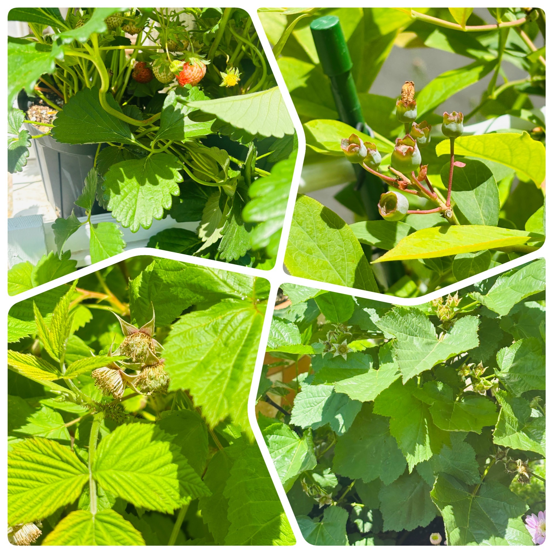 庭のイチゴが赤くなってきたー鉢植えにして棚で育ててるせいか虫の被害はいまのところなし昔はダンゴムシやらナメクジやらにやられてたけど今は鳥の視線を感じるくらい(笑)そろそろネットでもかけないとあかんやろなぁ 右上がブルーベリーめっちゃ小っちゃいブルーベリーの赤ちゃん可愛いね~その下二つがラズベリー、右はレッドドリームっていう品種ラズベリーとブラックベリーは知ってるけどレッドドリームってのは初めて 左上がブラックベリー日当たりがちょっと良くないので育ちが遅い購入した苗に一本長い枝が出てたのがランナーだったwポットに挿したので根付いたらまた鉢に移植できそう右上はレモン品種はよく覚えてないなぁシチリアレモンだった気もしないではないwつるんとした皮のレモンが実るんだけども...去年の収穫は1個一昨年、すす病で葉っぱ真っ黒になってしまった去年はリセットの年って諦めて今年はアホになって狂い咲き?こんなに花ついたの初めてだわ(笑)摘花とかした方がいいんだろうけどよくわからんので放置左下が3月に移植したイチジク順調に葉っぱ増えてる!!今年も実をつけてくれるだろうか?空地からの雑草の侵入がやばいので防草シートを敷かせてもらおうか検討中つる性のがいっぱい絡んでくるんだよねさすがに今年は放っておけん右下はライムまだまだ小さい木だけど蕾が3つついてた実がついたら楽しいけど無理かな成長して姿を変えていくのを見るのが楽しい毎日そんな私の最近の日課はアゲハの卵とナメクジとの闘いなるべく薬を使いたくないので今日も水やりして相棒のピンセットと防衛してきまーすスマホの方で写真の加工をやってみた!コレ楽しい