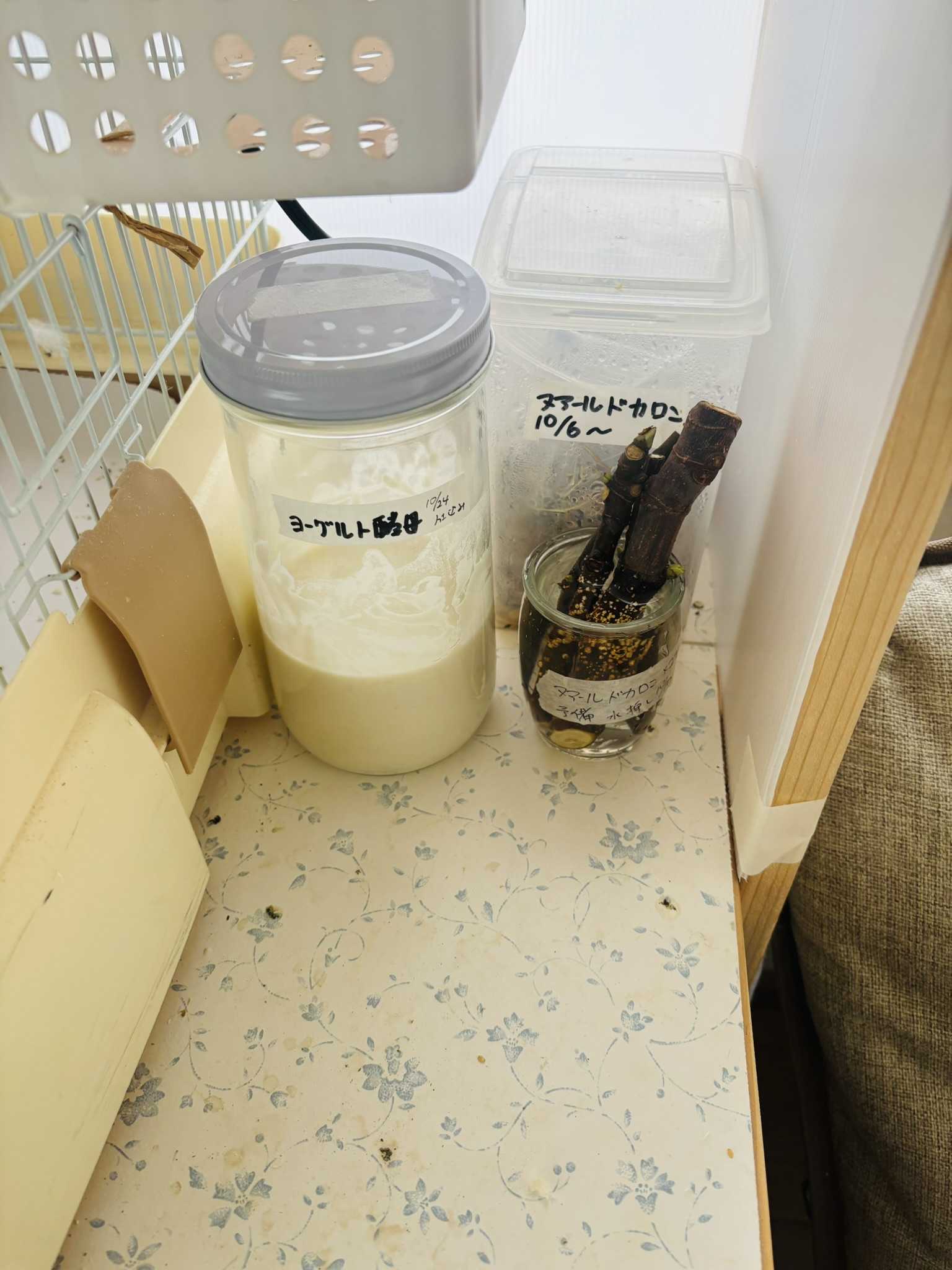ヨーグルト、準強力粉、水を同量で酵母の餌にはちみつ少し