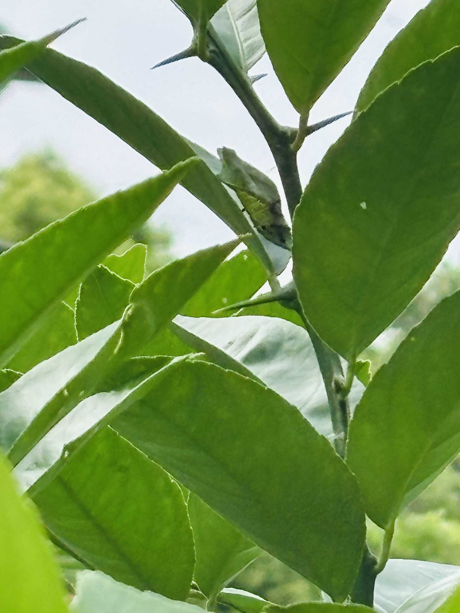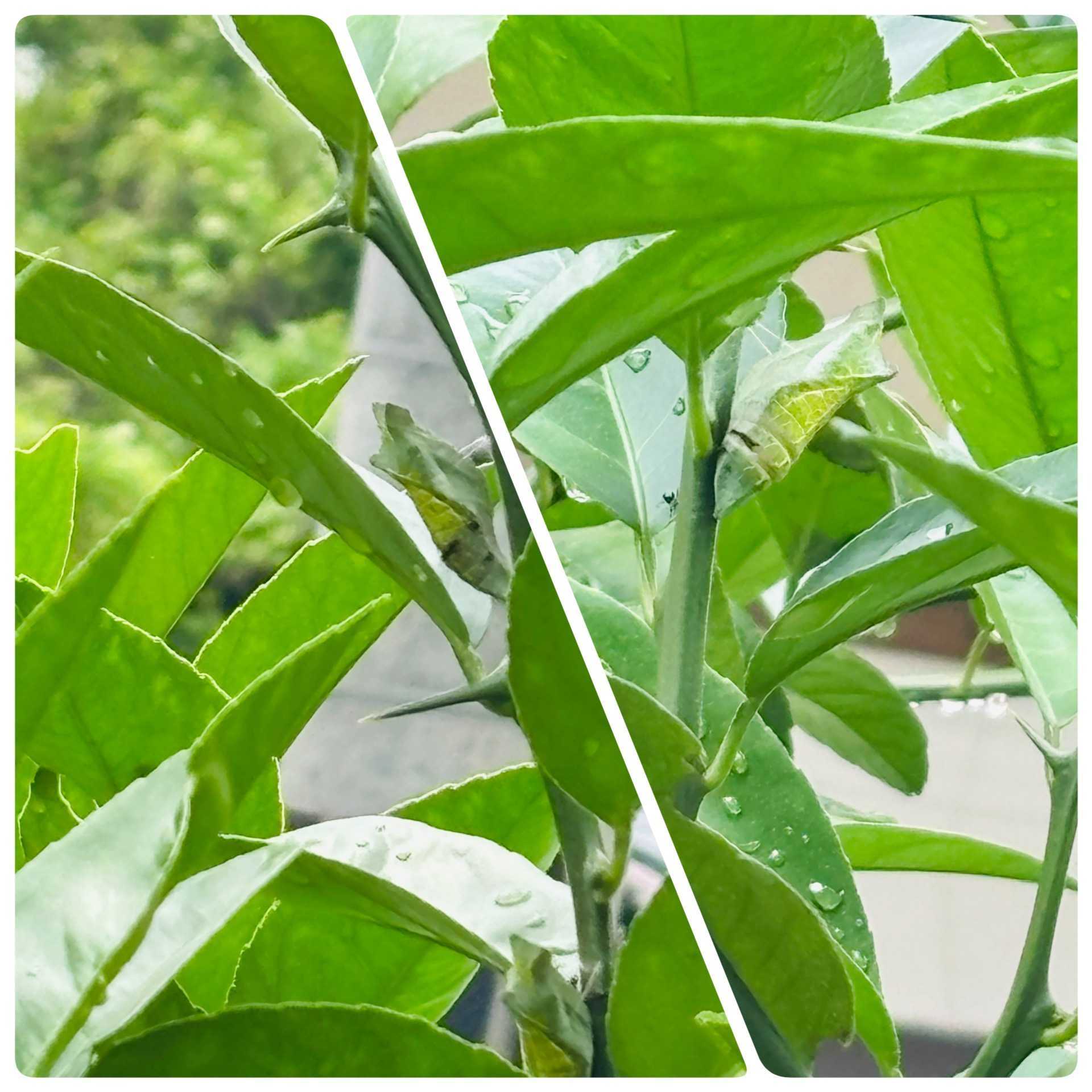 あれから5日後...左側が上の子日記更新した夕方には蛹の姿になってた右側の子は翌々日の朝見たら蛹に蛹になってから7日~10日で羽化するらしい午前中に羽化する子が多いらしいので見れたらいいなていうかさ下の子、どこかわかる?いると分かってても見つけるの難しかったw で予備軍です(笑)そばでは食事中の親もいた今年はレモンの木の調子がいいので野鳥たちに見つかりにくいのかも青虫くんがこんなにいるの初めて見るわ一昨年はすす病にやられて木全体真っ黒で青虫くんの目立つこと!ここにいるよ~!食べに来てッてなもんだったw去年はリセットするために枝葉落としてスカスカだったからね今年は立派に成長したレモンが守ってるようです ブルーベリーの色がだいぶ濃くなってきたよ収穫時期が6月らしいのであと半月くらい?まだまだ小さな木なので貴重な収穫になりそう鳥対策そろそろ必要かも3月にリセットしたジャスミンの鉢スリットから大葉が生えてた(笑)気づいたらこんな立派!今更植え替えもできねーここで収穫待ちということにきゅうりの赤ちゃんも発見!朝の水やりの後、いろいろ探すのが日課に宝探しみたいでめっちゃ楽しい( *´艸`)そして今日からダイエット開始~とりあえず4日間、ダイエットジュースを朝夜2食置き換えお昼はおにぎり1つと野菜サラダだけお水を1日2L4日後にみんなで報告大会それが終わったら1食置き換えで1か月すでにお腹空いてる(笑)水でも飲むか結果が出るまで頑張れますように!