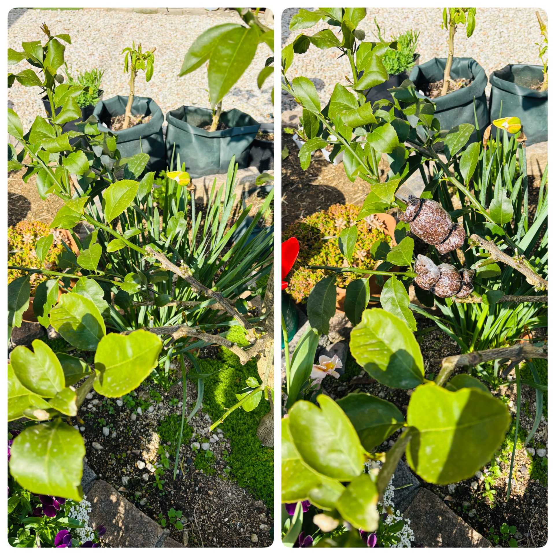 毎日チェックしてるのに、こんな大きな子がいたうちのレモン、毎日のように卵の駆除頑張ってそれでも生まれてくるのは「ごめーん!!」ってちびちゃい黒ちゃんのうちにピンセットでポイしててなのになぜか青虫になると駆除できない(笑)なるべく卵のうちに、黒いうちにって頑張るんやけど私の目を逃れてここまで育っちゃうとなんか可愛らしく見えてしまう、いじらしくてwそれにたとえピンセットでも手応えありすぎて無理、、うごうごするやん!?マジ怖い、ぞわぞわする、無理それに我が家のレモンの木はご近所の野鳥サンの芋虫養殖場となっていて、大きくなると消えていくさなぎになる子は本当に少ない弱肉強食の世界、頑張れ私は可愛いレモンの木の方が大事なのよほんとゴメンね 今日見つけた子、さなぎになる準備かな~って思って角度替えて覗いたらんん???なんか形違う?あれ?って思って手を伸ばしてカメラで見たら2匹並んでた最初に見つけたのは下の子だな上の子は明日にはさなぎになってるかな ここまで来たなら葉っぱも食べんし孵化した姿も見てみたい気はする温かい目で見守ってやろうかとw大人になって卵産んだら駆除するからねー去年のジャンボピーマンとパプリカ鉢上げして軒下でビニールかけて越冬にチャレンジ春までは葉っぱ残ってたのに全部落ちちゃったもうダメかなー?って思いつつ置いてたらなんか違うの生えてる??上のってもしかしてカボチャだったりする?下は、、トマト?っぽいケバケバあるんだけど?このまま置いといたら育つかな雑草ではない、、、気がするんだけどうちの庭でこんな葉っぱの雑草には見覚えないないや、分からん(笑)心当たりは去年から始めた生ごみコンポスト実家では芋が生えてたしな何ができるか楽しみにしてみよw虫も花も鳥たちも頑張ってるね私も負けんぞ~
