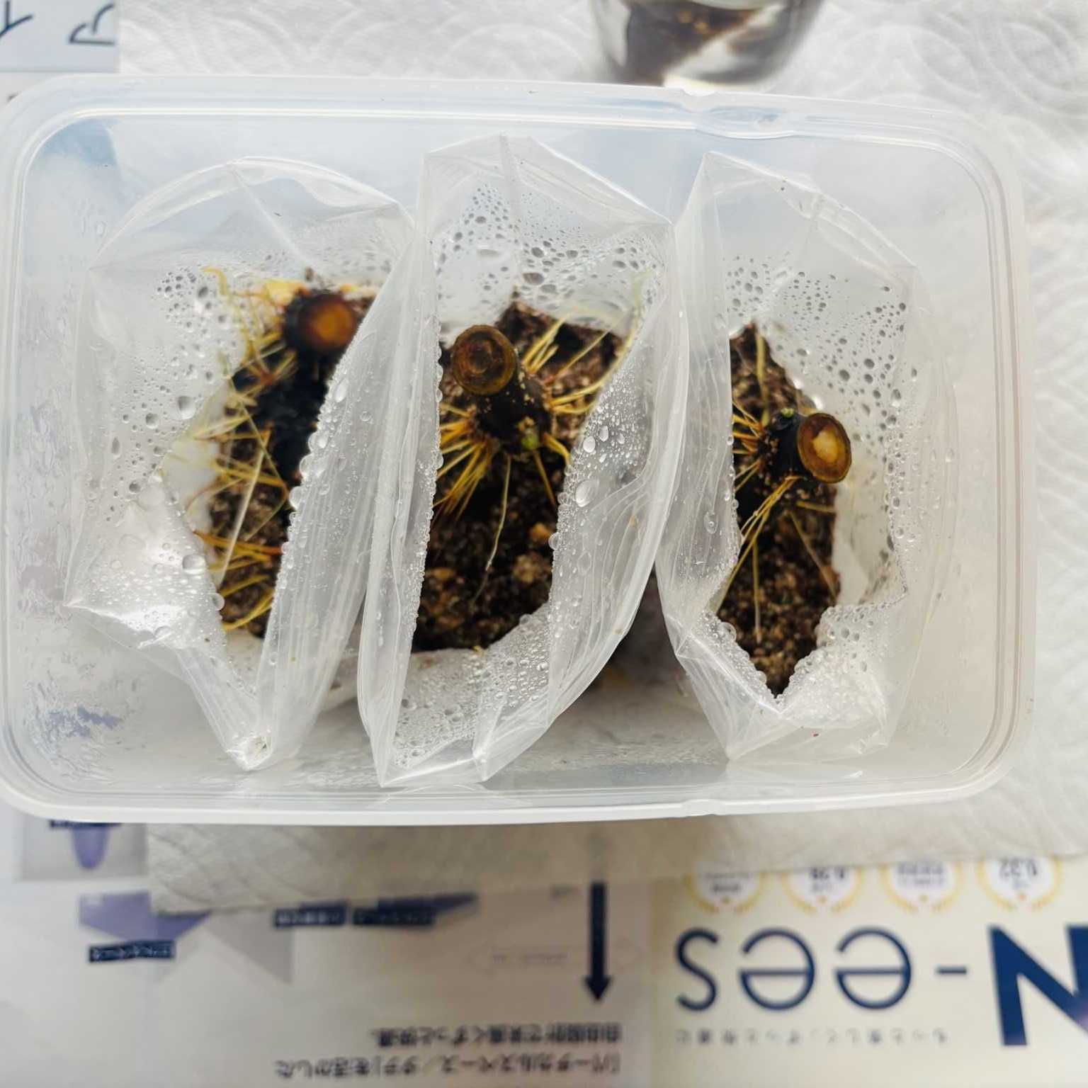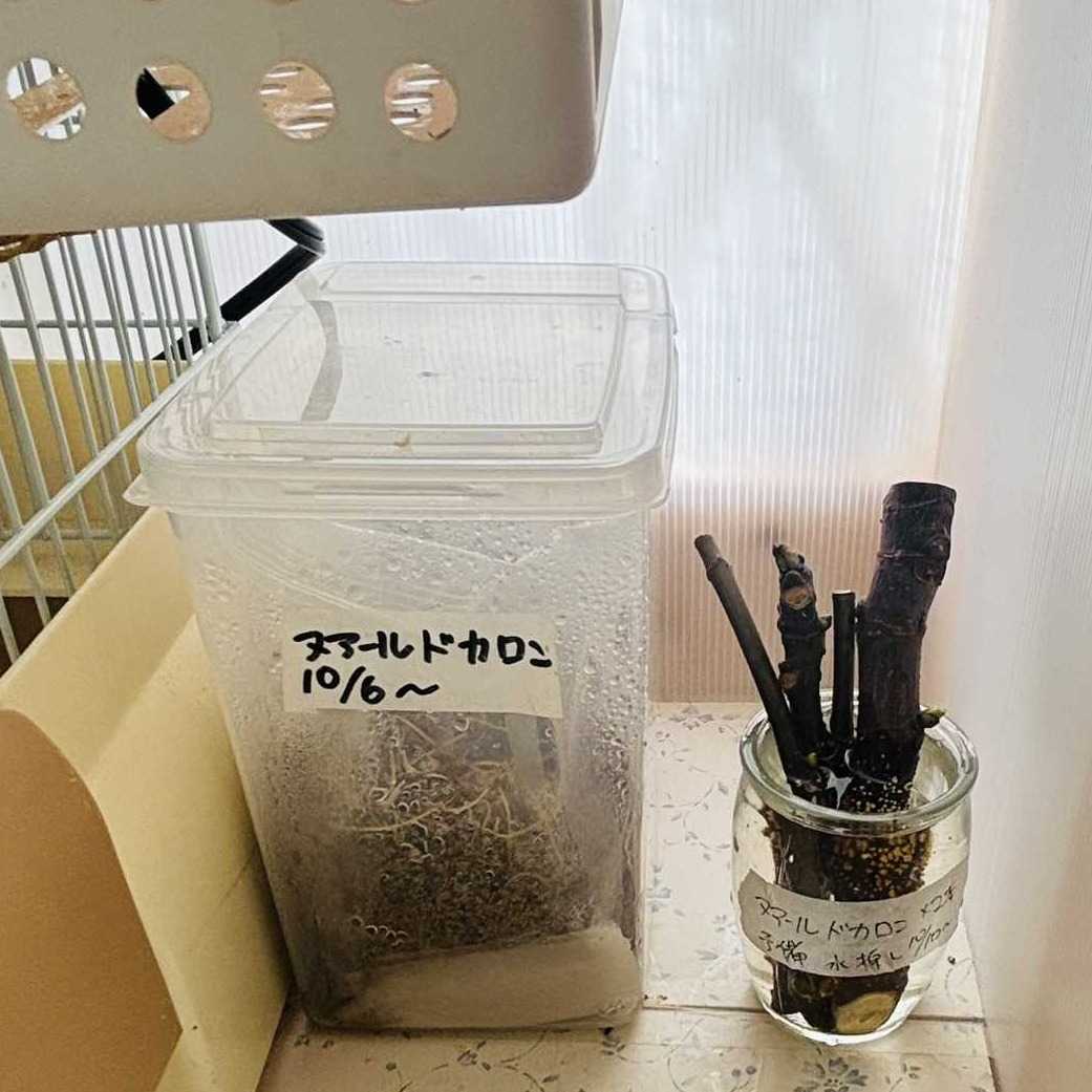 黒イチジクの挿し木10月6日に土に挿したのが謎の進化をするので10月10日に保険で水挿しも作っておいた鳥かごの隣でヒーター置いてるので25℃~28℃くらいかな水に差した方は根っこが出始めて新芽が出てきたこのまま様子を見て大丈夫そうかな で、妙なとこから根っこが生えてた袋挿しの子達今こんな感じ・・・ウニ?これ、あれだな過保護にしちゃって容器に蓋したせいなんだろうな土の中だけじゃなくケースの中も潤い過ぎて水求めて全身から根っこ生えたって感じ??ちょっと気持ち悪いくらい根っこがうにょって伸びてて面白くてそのまま見守り中wでも、生きようとする力って凄いなって思う根っこの集団の中から芽が出てきた!真ん中の差し穂からまず1つどこまでちゃんと育つのかわからんけどこういうのってやっぱり楽しいゆっくりでいいから大きくなってね私もいっぱい勉強しておくよちょっと果樹苗増えてきたので日記のカテゴリ整理していこw子はるもいつかお世話してちょうだいね~