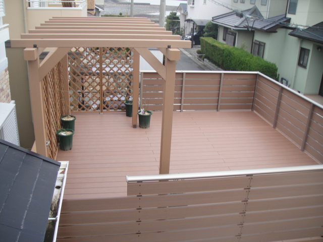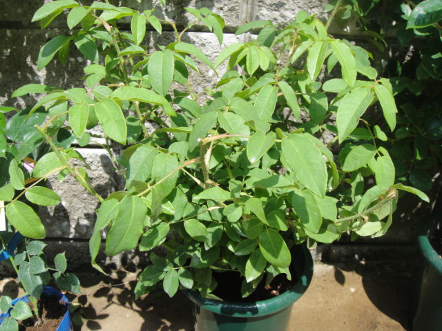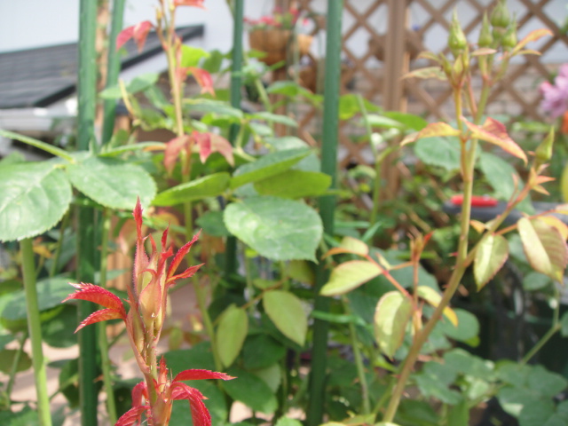 今年の1月の終わりに新苗を予約で注文した。予約注文は初めて、、、忘れたころに(5月)やってくるのね。。。去年の6月から約半年、、、、どの薔薇を買うか選ぶのは楽しかった。凝り性なのではまると止まらない性格。(詳しくは購入履歴1~4にある)私にとって初めてお金のかかる趣味。。。夫はもともとお金のかかる趣味(ゴルフ)を持ってるからか私の新しい趣味について何にも言わなかった。でも法事のときに親戚に「うちのが薔薇にはまって、家の周り東西南北鉢だらけ。」とこぼしていたのを盗み聞きした。何にも知らないような顔して、見てたのね~~~(*´3`*)ゞ狭いところで薔薇の鉢と格闘してるのを知ってたからか、年末に私が駐車場の上をデッキガーデンにしたいって言ったときはすぐOKくれた。2月の始めに人工木材のウッドデッキ完成。本物の木ではないのでどれだけ水をかけても変形しないらしい。水道も二階とつなげることもあきらめたけど、立派なパーゴラだけはつけてもらったヾ(*´▽`*)ノ今年の2月3日撮影ちなみに今のウッドデッキ右側は野菜コーナー工事の間薔薇の鉢はせまい庭にまとめておくと水やりも楽ちん。1月27日撮影こんな感じ。びろ~~んと一番のびてるつるはスパニッシュとポール冬は枝だけだから場所とらないんだよね~~だからまだまだ薔薇置けるって勘違いしちゃうんだよね~~だからウッドデッキができたときもっと薔薇が置ける~~~~とうれしくてなんと新苗を8苗も購入した。。。たしか8苗注文すると10%引きだったんだ。10%引きでひとつ1000円ちょっとだった。でも5月の初めに新苗が来る前にそれまである薔薇たちがどんどん大きくなってきて、幅をとってきて、、、、パパ、ごめん。ウッドデッキできても東西南北また鉢だらけ、、、になると思う。( ̄∀ ̄;)予約新苗 1、安曇野2、ロココ3、バレリーナ4、グリーンアイス以下はまだ花がないので名前だけ。5、ジブシーボーイ(紫)6、マニントンモーブランブラー(薄紫?)7、ゴールドフィンチ(黄色)8、アッシュウエンズディそれまで欲しいと思っても売り切れだったりしたものが多い。予約の新苗でなら、見つけることができた。ちなみに半年で購入したすべての薔薇はネットで「バラの家」「ザ ローズショップ」「ホワイトベア」の3店です。来年みんなきれいに咲かせられるようにがんばるぞヾ(*´▽`*)ノおまけ今朝の庭の様子毎日が薔薇の海状態です。。。o┤*´Д`*├oうれしい。。。にほんブログ村