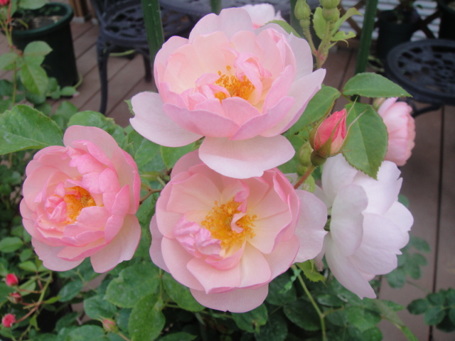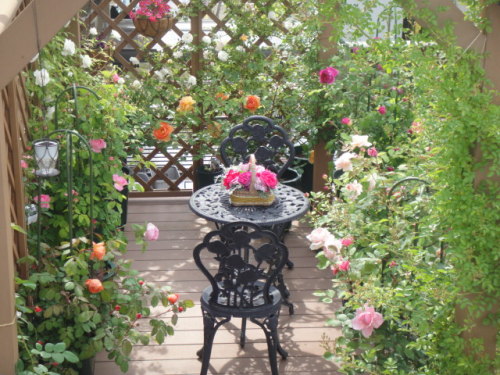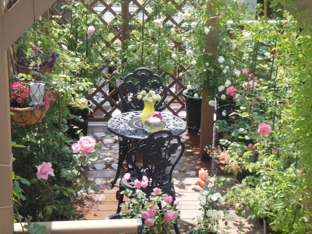 今日朝起きてベランダからウッドデッキを見るとん、、、、??右下、、、、エクセルサが咲きだした!!!(*´▽`*)イエ~~~イ♪近くで見るとちっこい赤いかわいい花がいっぱい咲く。ぜんぶ咲いたらきれいだろうなあ。エクセルサは遅咲き。もう一番花が終わってしまった薔薇が多いけど大丈夫、大丈夫。まだ咲いてるお友達もたくさんいるからねd(゚ε゚*)エクセルサちゃん。。。(変なおばさん入ってる)ボレロさんたちでしょ。ボレロさんの横にはピエール2号もまだ咲いてるしブルームーンだってこんなにきれい。レオナルドダビンチさんも花がまだこんなにいっぱいあるんだよ。だから安心してゆっくり咲いてね。おまけ今日の庭のシーン一度切り戻したビオラほんとに長く咲いてる。。。すごい。。。ラティスの後ろの高いところで咲くピンクのクレマチス パミーナ(ラベルはピンクでもあやしい、、、紫っぽい)お顔が見たいよぉ~~今日は5月の最終日曜。5月の日曜は4日、11日、18日と三週連続薔薇園へ。今日も岐阜県の花フェスタに行こうと思ったけど、きっとまた混んでるよね~~とあきらめた。薔薇園の写真もまた近いうちにアップしとかないとね。にほんブログ村