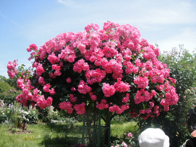 恥ずかしながら薔薇園は今年初めて行った。それほどまったく薔薇を知らない人だった。薔薇園に行くといろんな薔薇があり、誘引の仕方、仕立て方など勉強になることも多い。ひとつひとつの薔薇自体の美しさはもちろんそれぞれの薔薇の個性を生かせる誘引方法もあるのだ。とても奥深いと思う。薔薇にはまる前の私はみかんの木のように薔薇を植える。だから広い広い庭がなければ薔薇は無理。そんなイメージしかなかったと思う。でも違った。つる薔薇は少しの地面(40センチ)があれば植えられるし、上へ上へと伸ばせば壁面が花壇?(キャンパス)になる。地面がなくたって鉢で育てればベランダでもウッドデッキでもどこだってできる。風景としての薔薇。とても魅かれる。ラティスだったり、フェンスだったり、小屋だったり、壁面だったり、アーチだったり、窓辺だったり、パーゴラだったり、、、、夢は広がる自分はいったいどんな風景をのぞんでいるんだろう。どんなふうにしたいのか。薔薇の色は?、形は?、大きさ?はどんな風にどんな場所に組み合わせるのか?、、、、、なんと楽しい難問だろう。広い世の中には今この瞬間、花どころじゃないよ、、、それどころじゃないって人もいっぱいいるだろう。私も半世紀以上生きてきてそれどころじゃないっていう日々もいやっていうほど送ってきた。でもこうして今生きているのだから心配ごとを増やさずに笑顔で好きなことに夢中になりたい。それができる自分の健康、周りの環境家族に感謝して、、、、以下は5月18日に行った浜名湖ガーデンパークの写真春風 スタンダード仕立てスタンダード仕立て憧れる。巨大アーチの下こんな風に下を向く薔薇をアーチにできたらなあ。アーチの側面満開の薔薇アンジェラ 我が家のアンジェラに比べるとすごく密集して咲いてるなあ。。。鉢植えの薔薇によるガゼボアルベリックバルビエのような大きくなるつる薔薇も小さな鉢。自動灌水器がついてた。こちらも自動灌水器つきの薔薇の壁水やりたいへんだもんなあ。鉢が多い我が家もいつか欲しいなあ。。。ホワイトガーデンも素敵花壇も薔薇に似合う花たちが植えられてる。こんなふうに一重の薔薇が生垣の下の方に誘引されているのも素敵だった。数ある薔薇の中で一つだけ気になるものが、、、最初はめずらしく夫が言ったんだよね。「この薔薇かわいいね。」って。「うちにはこういう柄ないよね。」って。薔薇本の写真では見たことのある薔薇ヴァリエガータ ディ ボローニャもっともっと派手なのかと思ってた。なのに小さくて丸くてとってもかわいかった。一目ぼれ、、、、もうしばらくは買わないって思ってたけど出会ってしまった運命。買ってしまいそう、、、、にほんブログ村
