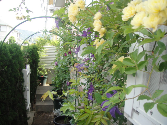 家の西の通路たった90センチくらいしかないところそこが紫と黄色の小道になってる(〃゚д゚〃)手前から黄もっこう、紫のクレマチス、スイートセレナーデその奥にゴールデンセレブレーションの蕾がパンパン!!(*-∀-*)午後しか日に当たらなくて強風のあたる場所でも薔薇とクレマチスは咲くんだねぇ~~樹形がコンパクトと説明があったERレディエマハミルトンとスキャボロフェアー我が家の薔薇、、、コンパクトというより背が低いだけのような、、、、、、(*´3`*)ゞ左がレディエマハミルトン 右がスキャボロフェアー野菜の支柱オベリスク仕立てのヤングリシダスの比べるとこの高さの違い横に広がると場所とるんだよね~~限られた場所でいっぱい咲かせたい!!そこで今からオベリスク仕立てにちょっとはコンパクトになったかな。。。蕾が裏返っちゃったかなあ。。。。おまけ今日とってもきれいに咲いてくれた薔薇三つヤングリシダス かわいい♪つるアイスバーグ 去年の6月から11カ月やっとお顔が見れた(*´ェ`*)純白、、、きれい、、、そして昨日マンゴーシャーベットのようだったロイヤルサンセットはぁ~~~どんどん咲いてくるもうじき白いつる薔薇も咲く、、、もう夢がかなっちゃいそう、、、、ヾ(*'∀`*)ノ今日も遊びに来てくれてありがとう。ポチとお願いします。にほんブログ村