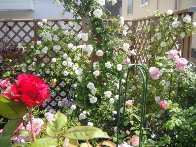 今日はペンキ塗り塗りの2日目。家の角にある15年くらい経っているラティスフェンスのペンキ塗り。看板がついていたところだけ痛み方が違う。昨日のフェンスに比べ何回塗っても沁みこんでいってしまう。相当痛んでいる模様。裏側は塗れないけれど、表側しっかり塗れば、すこしは耐久性よくなるかな。できあがり。家の方からポールズヒマラヤンムスクの枝を2本ひっぱてきた。上から庭に太い電柱があってその前にデカイ鉢を置いてある。そこにいるポールヒマラヤンムスク。鉢だけど立派に大きくなってる。去年のポールヒマラヤンムスク奥の電柱の横グラハムトーマスとコラボ予定。クレマチスダイアナの場所は今春ははごろもジャスミン。ポールズヒマラヤンムスク根もとここから白のパーゴラの上を通って玄関へフェンスの上のつる薔薇の枝はみんなウッドデッキに向かってる。スパニッシュビューティの枝は今年は明るい手前の方に伸ばしてみた。、、、、、、せまい庭、、、、、上見るとつる薔薇の枝だらけ、、、、、、、、、春はどうなるだろう。薔薇ジャングル????枝ばっかりでカラフルなものが見たい。多肉父さんで遊ぶ。きゃ~~可愛い。。。カラフル♪父さん女の子にキャラ変えよう。多肉父さん「やめてくれ~~」Just relax.リラックスしよう。にほんブログ村