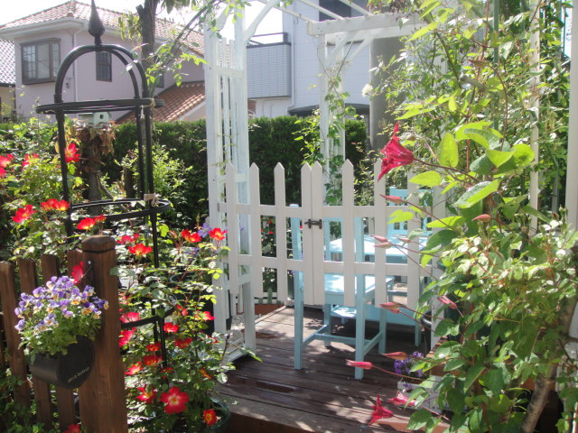 今日は風もなくいい天気。こんな日はうきうきする。まずはペンキ塗り。もうだいぶ古くなってきた小さい庭のウッドデッキ。こげ茶にペイント。悪くなってしまったところもあるけどとりあえず今年もペンキだけで耐久性アップ。これは一年経ったけどまだ大丈夫。毎年ペンキすればどのくらいもつのかな。屋内用の木のいすと棚を改造したテーブル。カントリーグリーンにペイント。今日は暖かくて植物たちも喜んでる。あっ小さい春みつけた!スノードロップ。すごくちっこい、、、、。オキザリスもいっぱい開いてる。曇りの日は閉じてる。小鳥さんのついたハンガープレートはここに付けた。この小さいアーチの全体像はこんな感じ。左側の小さいラティスフェンスの後ろにある鉢にはこれでもかっていうくらいたくさんチューリップの球根が植えてある。きれいに咲いてくれるといいな。小さいアーチの横にある野菜の支柱に誘引してある薔薇をアーチへの誘引にすることにした。右側はバリエガータ デ ボローニャ。浜名湖フラワーパークで一目ぼれした薔薇。太い枝が一本。長くなって二つに分かれてる。短い枝がもう一本。。。。枝の数は少ないけれど向こう側まで届くほどの長さ。左側はヤングリシダス。花つきのいい薔薇。ボローニャに比べるとすごく枝が多い。もっと少なくした方がいいのかな。とりあえずこのまま誘引。小鳥さんのところまで枝が来た♪両方の枝はこんな感じ。こんなのと、、、(ボローニャ、薔薇園)こんなのが、、、(ヤングリシダス 5月15日の庭)この小さいアーチに咲く、、、、、楽しみだなあ。まだ咲いてるラベンダー。Open your mind, arms, and heart to new things.新しいものとの出会いに、あたまを、両腕を、こころを開こう。にほんブログ村