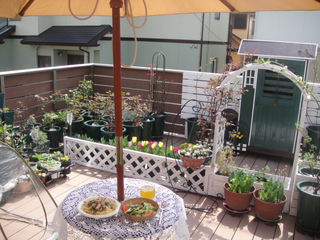 おしゃべりが大好きな私。近所の人との立ち話や娘との長話。友達とのランチやお茶会。仕事で研修行っても同僚たちと笑顔で愚痴る。それなのに、、、、今は、、、近所の人と立ち話が長くなるときは「ごめんね~~急いでるから」といそいそ帰る。この間の研修だって一番すみっこでわざと知らない人の近くに座りめだたないようにしてた。ランチさそわれても行きたいけど遠慮した~~悲、、、、、泣、、、、、ぜ~~んぶ更年期の狭心症のせい。いつ動悸がおさまらなくなるか予測がつかないけどたいていおしゃべりしてる最中にくる。悲しいけどしかたない。もうちょっと症状が落ち着けば以前のようにまたおしゃべりしてゲラゲラ笑えるはず、、、、だから。植物と会話するしかない。今日は気持ちの良い天気の日曜日。小さい夢をかなえてみた。お外でランチを食べてみた♪ダイソーでテーブルクロスも買ってきた。気持ちいい~~~お豆入りグリーンサラダとツナおろしスパ。チューリップのお花見しながら。サンサンと太陽を浴びたチューリップは透き通っててとっても綺麗。デザートはコーヒーとアーモンド。そうして雑誌を読むのがプチ幸福。「趣味の園芸」の薔薇のところを読む。ん?ブックオフ100円って、、、(←ケチかい!)この雑誌の中の記事で森林と血圧の関係のことが書いてあった。もともと血圧の高い人が森に来ると適正な値に下がり低い人は逆に上がるのだそう。。。森という環境が血圧を適正値に調整してくれるのだそう。。。すごい。。。我が家の森、、、、↓だから、庭にいると調子がいいのかなあ。植物の力ってすごいなあ。Courage is grace under pressure.勇気とは、窮しても品位を失わないことだ。にほんブログ村
