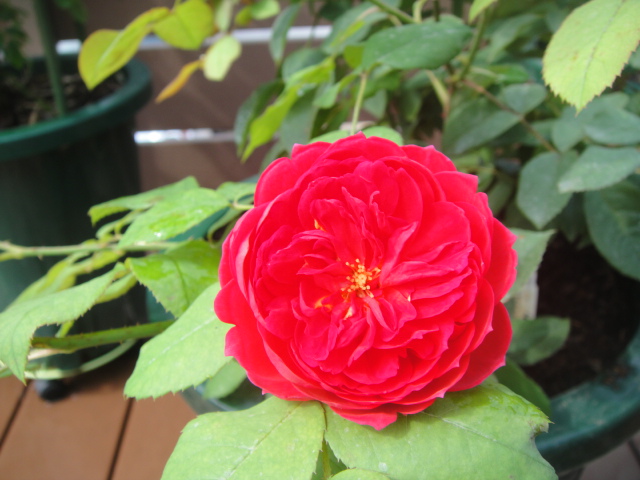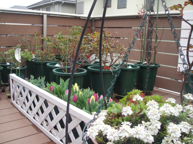 薔薇のお世話と一口に言ってもいろいろある。剪定だったり誘引だったり虫退治だったり病気退治だったり肥料やりだったり植え替えだったり、、、(こうして書くといっぱいあるな)でも今一番好きな薔薇仕事は水やり~~~♪寒くないし気持ちいいしマイナスイオンで気分よくなるしなんといっても薔薇がすごく喜んでる感じがするから♪我が家には自動灌水器がある。家の周り(南、西、北)で建物にくっつけて置いてある薔薇にだけ一日一回10時に5分間水が出る。冬は三日に一回だった。自動灌水器が来るまえは狭い通路でよいしょよいしょと大きいジョーロを運ぶのも重かったし、長いホースを伸ばすにしても狭いので薔薇の枝やらなにやらにひっかかって結構大変だった。今は楽ちん♪狭いところは機械におまかせだ。玄関周りや花壇それに一番一杯薔薇の鉢が置いてあるウッドデッキは自動灌水器は使ってなくて自分でやってる。ホースを充分伸ばせる場所なのでのびの~~びできる。今日も午前中気持ちよかった~~。薔薇が「うれし~~~、きもちいい~~」って言ってるのが聞こえる。でもこんな私でも薔薇にはまる前は水やりが大の苦手だった。何回植物を枯らしたことか、、、、とくに観葉植物。観葉植物を数千円で買ったことがある。水やりの失敗でみごとに枯らした、、、悲しい思い出、、、、。今考えると明らかに水やりの方法が間違ってた。その観葉植物に水はやっていたけど明らかに少なくて上の方にチョロチョロだったんだよね。今思えば観葉植物さらお風呂かなにかに持って行って一週間に一回ぐらいどば~~~ってあげればよかったのに。そのときは知らなかったんだ。植物の根は水と一緒に新鮮な空気も欲しかったってことを。薔薇の本読んでて初めて知った。水やりって水をやるのと同時に鉢の中の古い空気を押し出して新しい空気を入れてあげるんだよね。もっと早く知りたかった。今、ウッドデッキの薔薇はみんなダイソーの200円のキャスターに乗ってる。古いのはもうコロコロがさびてうまく動かないけどでも乗せてる。下からダ~~~って水が出てるのがわかるしペタって下にくっつけてるより空気が入れ替わりやすそうだから。薔薇を知って植物がますます好きになった。薔薇、ばんざ~~~い♪偶然、ブルーの濃淡の寄せ植えになった。種まきのノースポールとビオラ、、、、ちっこい。こっちは50円苗のビオラたち来年は苗ばっかにしようかなあ。。。。ビオラの模様を見るのが好き。シンプルも可愛い。暖かくなってきたのでネックレスのような多肉ちゃんもお引っ越し。黄色の庭は後は黄モッコウを待つばかり♪一番最初に咲いたチューリップがほろりと落ちた、、、、チューリップは一週間ぐらい花期なのね。Little successes pave the way to bigger successes.小さな成功が大きな成功への道を開く。にほんブログ村