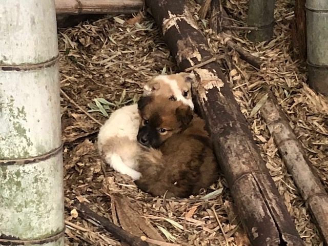 私の近所の山のお寺にまだ仔犬がいます。数日前のブログ仔犬の住む山のお寺2,3日は見なかったのだけれど今日竹藪の中をのぞいてみたら以前より元気がなさそうに見える仔犬が2匹いました。2匹が寄り添う姿を見てもしかしたら数日前に捨てられてそれから何も食べてないのかもしれないと思い出したらいてもたってもいられなくなって勇気を出してお寺の方に相談しました。市役所に連絡すると行くところは決まってしまうのでやめたほうがいいと言われました。私が餌も水を置いていいこと(お寺内なので許可を得た)新しい飼い主をネットやポスターで探すことなどの了承を得ました。さっそく今日餌と水は置いてきたけれどぜんぜん食べてないようです。捕獲してまずは動物病院に連れて行きたくても近づくと人間が通れない竹藪の中に入ってしまうので捕まえられません。どうしたら捕まえることができますか。まだ仔犬で威嚇とかはまったくしていません。犬の保護に詳しい方がいれば教えてもらえると助かります。また犬の里親になりたい方、またそういう人が身近にいる方はコメント欄にご連絡ください。私のメールアドレスを連絡します。この2匹です。手前に餌と水を置いてきました。捕まえようとすると竹藪の奥に入ってしまいます。明日また行ってきます。にほんブログ村