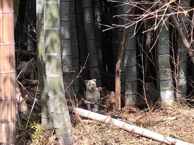 おととい散歩のとき、山のお寺に行く途中の竹藪の前で柴犬風の茶色の仔犬を見つけた。そのときはすぐに竹藪の中に隠れてしまった。昨日の散歩ではスマホで激写しようと準備万端で山の中に入っていくと昨日とは違う白い仔犬がいた(◎_◎;)昨日の仔犬も可愛かったけど、この白い犬も可愛い。昨日の仔犬と大きさは同じくらい。生後何か月くらいだろう?この犬は怖がらずに私の顔を見に来た。そしてそのまままた竹藪に入っていった。???山に住む2匹の仔犬???な、、、なんなんだろう?吠えることも威嚇することも喜んでしっぽを振ることもない。ただ「あんた誰?」って感じの顔してた。そして今日も行ってみると、、、、竹藪の前にモサモサと何かがいる!!!スマホではこれで精いっぱいの拡大、、、なんと仔犬が4,5匹いる!3匹くらい近づいてきたよ。また「あんた誰?」ってかんじ(~_~;)このお寺に来るようになってほぼ2週間。山の散歩中、誰にも会ったことはない。、、、、こんな仔犬が住んでいることを知っている人はいるのだろうか?お寺の人に言った方がいいのかな。勝手な想像だけど、市営住宅に住む動物好きのおばあさんか誰かが餌をあげてるのかもしれない。どうかこのお寺のお狐様(←お堂の前にいる)仔犬たちの未来が幸せでありますように、お守りください今日の庭仕事久しぶりの水やり春が近づいてきて嬉しいけれどまた毎日水やりの季節が近づくと思うとちょっと大変だな~と思うのは正直な気持ち(~_~;)鉢を少なくするしかないかな。クレマチス花壇の雑草を取り手作り米ぬか堆肥をたっぷりとあげておいた。今年も綺麗に咲いてくれますように(#^^#)クレマチス フルディーンFlowers are our greatest silent friends.花は最高のもの静かな友にほんブログ村no
