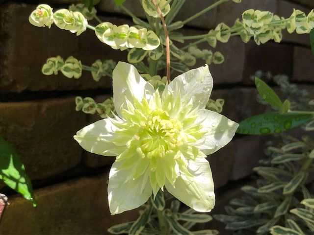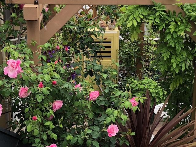 昨日家にきたセールスらしき人に「ここはお店ですか?」って聞かれた。玄関前に花がたくさん咲いているから?だいたい家に訪ねてくる宗教の人もセールスの人も庭の花の話をしてくる。「センスがいいですね」とかおだててもらってもへんなものは買わないからね。でもお店って、、、なんのお店?お花屋さんかな?カフェかな?、、、にんまり~ヾ(o´∀`o)あっあぶないあぶない。へんなセールスはすぐに断るのが一番だよね。大きなクレマチス ジャックマニービオラが咲きだした。この真ん中の黄色いしべとフランスアンフォの黄色とよく似合う(#^^#)数少ない我が家のピエールの後ろには白万重(よく見えないな、この写真(~_~;)ラベンダードリームとテッセン雑草は見ないふり(*´з`)夕方はしぶい色になるクレマチス リメンバランスネットをつたって咲いているのはグラベティービューティミケリテが4枚の花びらで咲いたり6枚で咲いてりしてる(*^^*)ミケリテの緑の葉とクレマチスモンタナの茶色い葉のコラボも素敵(#^^#)今日の薔薇雨の前に避難させておいたニューウェーブがひらひらして咲いてて美しい(#^^#)絞りの薔薇 クロードモネも咲いてきた。今年は咲くのが遅くて心配したよ。家の北側でひっそりと咲くニュードーン大人可愛いピンクだね~ヾ(*´∀`*)ノそしてなんといっても今年メダルをあげたいくらい綺麗に咲いてくれてるのがジャクリーヌデュプレこの薔薇が少し咲いているだけでセンスアップしてるわ~(〃艸〃)暑くなってきたけどデッキに日陰が少しできた。花は失敗したけど葉が役に立ってくれる藤(鉢)藤の下では多肉の寄せ植え!(^^)!宇連ダムが0から10パーセントくらいになったそう。でもまた晴れが続くとなくなりそうだなあ。水やりが気がひけるからほんとガーデナーは困るわ~Every flower blooms in its own time.にほんブログ村