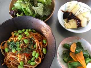 健康のために半日断食をやっていることもあって夫や息子を待たずに夕飯は一人で食べている。いわゆる「ハッピー孤食」(どっかのブログで読んだ)。お昼も夜も一人で作って楽しみながら食べている。不調のときは自分で作っても美味しく感じず、夫と外で食べても美味しく感じず、悲しかったな。以前に好きだったものもなぜかぜんぜん美味しく感じなくなってた。常に血糖値が高い状態で空腹を感じず、そのまま食べていたからなのかと思う。(糖尿病のせいではないかと疑う。)食べ物を美味しく感じるかどうかって体調にものすごく関わっていると思う。それが半日断食とPBWF食で体調が治り、食欲もでてきて、なんでも美味しく感じるようになった。普段は作りながらゆっくり食べてる。まずは山盛りサラダ。そのとき畑で採れた野菜と朝ストーブで焼いた焼き芋やストックしてある豆入りだ。それから野菜料理とご飯と漬物と汁物を用意してそれもゆっくり食べる。ときに野菜料理は豆料理になったりする。豆餃子とか豆ハンバーグ。そして汁物はみそ汁かキャベツスープか豆たくさん入りのミネストローネ。その後、デザートに果物山盛り、ナッツ(一日25個)ナッツ、ドライフルーツ入り全粒粉のパンに豆乳で作ったチーズを乗せて食べている。たまに夫に見られて「よ~食っとるな~」って言われているので夫にはたくさん食べているのはバレている。でもたまに会う姉とか娘には「痩せすぎ」とか言われるんだよね。姉なんて「絶対私より食べてない!」って強く断言してくる。でもよく料理を公開している人のブログを拝見するけど「少な!」って思うんだよね。私の食べている量より絶対少ないわ~って。でも上にも書いた通り、私は順番に食べるものから作っているので全部の食べる量を一度に見たことがない。なので昨日自分の食べているものを一度全部並べて写真に撮ってみようと思い立った。まずは畑に行って新鮮な野菜を採ってくる。(畑は最近は3日に一度くらいは行っている。夏になるとすぐ大きくなるので2日に一度キュウリができるころは巨大化するので毎日行くときもある)採れたてのレタス、ブロッコリー、ニンジンそれがこんな風になる。(@_@。こうして並べるとすごい量やん。Kさんのことをよく食べるなんて言ってたけど自分もものすごい量食べてるやん。山盛りサラダ、ぬか漬け(家の野菜)タケノコと菜花のみそ汁、ご飯、ブロッコリーはチンしてヴィーガンマヨネーズ。ニンジンは油なしのしりしり、果物はイチゴ、バナナ、マンゴー、ブルーベリーそしてナッツ。あと豆乳チーズのせ全粒粉のパン。PBWF食だとこんなに食べても太らない。8月からPBWF食を始めて最初1,2キロ痩せてその後ずっと47キロ台をキープ。姉にこの写真送りたいぐらいだわ~。たくさん食べているのを信じてくれるだろう。週末はこのトウモロコシの苗を植える予定チューリップ アンジェリケも咲いてきた(*^^)v新しく50代主婦ブログに参加しました。にほんブログ村ミニマリストのカテゴリーを2型糖尿病に移行しました。にほんブログ村↓いつもの薔薇ブログもよろしくね(*^^*)にほんブログ村<