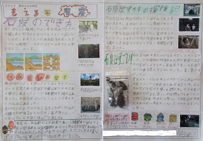 応援して!クリックするだけで募金できます。一日一回クリック募金。 晴ぼんの夏休み最大の課題である自由研究が無事完成しました。夕張の石炭博物館を見学して、石炭の歴史やエネルギーについて研究した物をまとめました。事前の計画に従って割り付けし図や写真もふんだんにいれて綺麗なまとめが完成しました。ドリルやプリントは順調に消化してますので、次は夏休み思いで新聞が待ってます。頑張ろうね・・・。画像クリックで拡大します自由研究「燃える石・石炭」◇◇◇◇◇◇◇◇◇◇◇◇◇◇◇◇◇◇◇◇◇今日のお食事朝、トースト、野菜サラダ、コーヒー昼、お茶漬け夕、豚丼、味噌汁