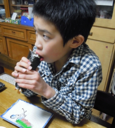 普通サイズの特製巻寿司をペロリと一本食べきって大喜びでした。