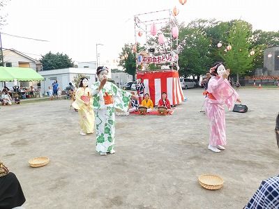 夜6時からの1時間程で盆踊り会場での公演ですので、沢山の出店に囲まれて観客もビール片手に応援、大変盛り上がりました。