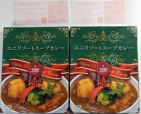 その景品のユニリゾートスープカレー2個、ユニガーデンのペア入場券件が届きました。