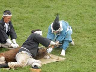 捕まえた鹿をゴザに寝かせておさえつけ、神主装束の勢子がノコギリで角を切り落とす様も中々見物でした。