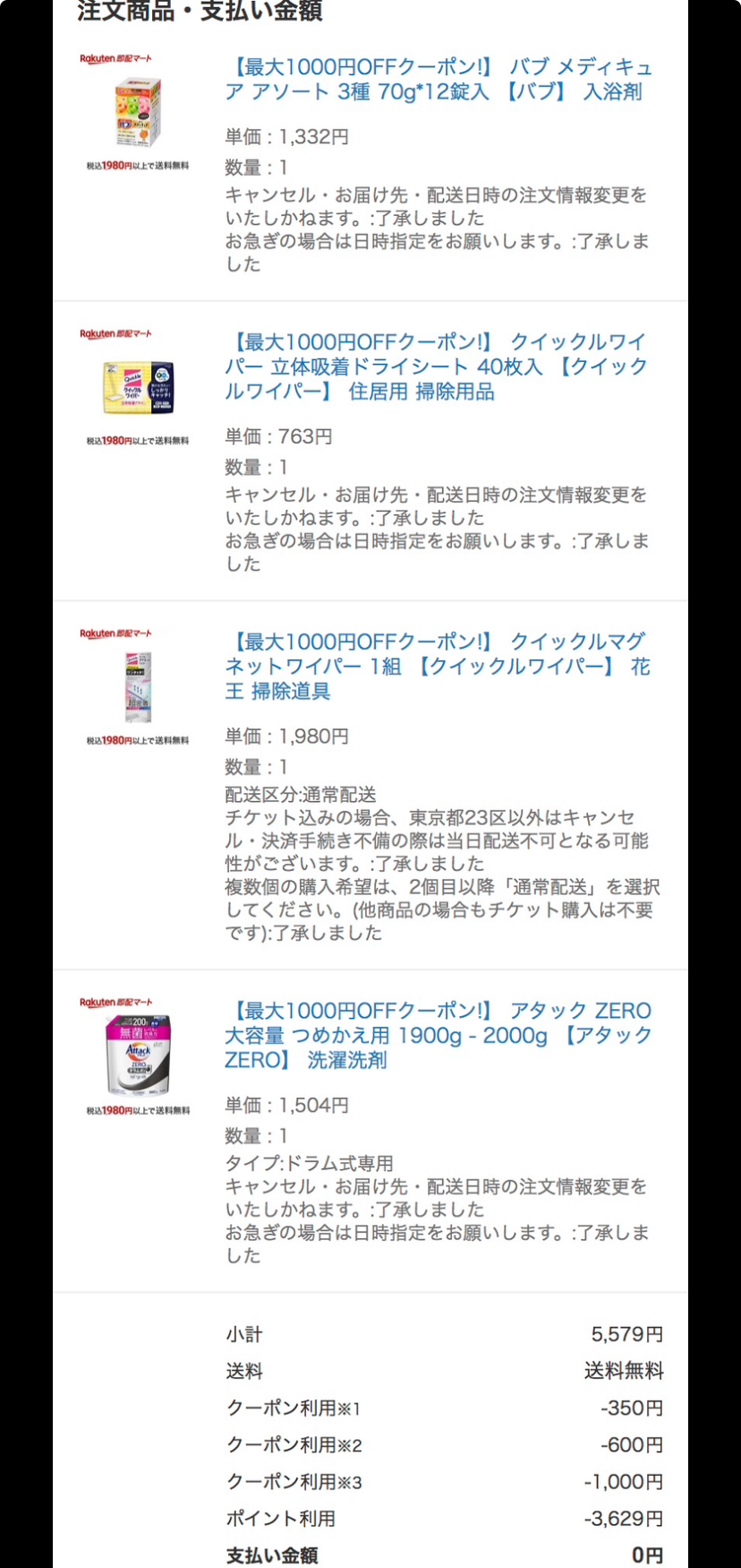 こんにちは!白クマさん情報で知り3クーポン併用して楽天即配マートでポチしました〜いやぁ、大変でした(笑)みなさん上手にクーポン使っていて非常に参考になりました。私はどうしてもクイックルワイパーが欲しくて。こんな感じになりました♪どーしても1000円引きクーポンが763円分とかしかならなくてこれでもいいかなと諦めかけたのですが白クマさんのブログ読み返して最後バブ入れたら3クーポン併用成功しました!白クマさんありがとうございました【最大1000円OFFクーポン!】 クイックルワイパー 立体吸着ドライシート 40枚入 【クイックルワイパー】 住居用 掃除用品価格:763円(税込、送料別) (2025/4/6時点) 楽天で購入 【最大1000円OFFクーポン!】 バブ メディキュア アソート 3種 70g*12錠入 【バブ】 入浴剤価格:1,332円(税込、送料別) (2025/4/6時点) 楽天で購入 【最大1000円OFFクーポン!】 アタック ZERO 大容量 つめかえ用 1900g - 2000g 【アタックZERO】 洗濯洗剤価格:1,504円(税込、送料別) (2025/4/6時点) 楽天で購入 【最大1000円OFFクーポン!】 クイックルマグネットワイパー 1組 【クイックルワイパー】 花王 掃除道具価格:1,980円(税込、送料別) (2025/4/6時点) 楽天で購入
