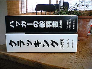 我が家で、一番厚い本。一冊でも重いけど、2冊だととんでもなく重い。もちろん、私の本じゃないです。w相棒さんの本。いまだに、中を見た事がありません。見たいような・・・見たくないような・・・見てはいけないような・・・複雑な気持ちにさせる本達です。「敵を知るなら、己を知れ。 己を知るなら、敵を知れ。」相棒、談。ところで、ニュースなんか見ていると「ハッカー」と「クラッカー」って同じ意味で使われていませんか?違和感、感じるんですけど。