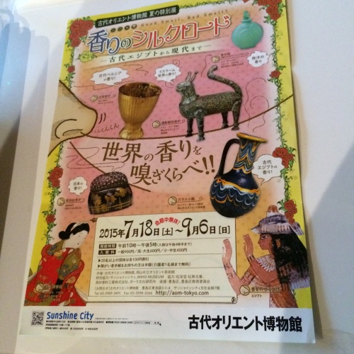池袋サンシャインシティにある、古代オリエント博物館に行ってきました。夏の特別展 香りのシルクロード 古代エジプトから現代までが9/6までになっています。入ってすぐのところに香りを試せる装置があり、バラや白檀、ムスクなどの香りがありました。結構リアルなミイラの作り方の説明とかがあったり、そんな時代でもアイライナーが存在していて、アイライナー用の容器、筆代わりの道具などが残されているのに驚きましたスパイスの香りとか、香水をガラス瓶に入れたものが置いてあり香り比べができて面白かったです綺麗に保存された鮮やかなガラス瓶や源氏物語時代のお香遊びの小道具、着物などもあり、思ったより大きい・小さいなあとか、きちんと伝わって残っているのにすこし感動もありました夏休み時期なので、結構いろんな世代の人が見に来ていたのですが、外の池袋の喧噪からすると、かなり静かで過ごしやすかったです外に出てからは、人ごみの落差でバテた気がしましたが、行けてよかったと思いました