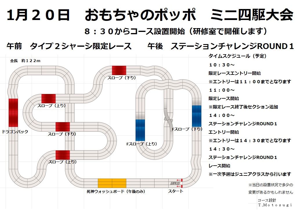 ーーーーーーーーーーーーーーーーーーーーーーーーー 「1月20日・おもちゃのポッポ・ミニ四駆大会」 in ローズアリーナ ●1月20日(日)・島田市ローズアリーナ 研修室 ●参加料 無料 【タイプ2シャーシ・限定クラス】と【ミニ四駆 ステーションチャレンジ 2019 ROUND 1 】を開催●AM8:30~PM6:00まで。(AM 8:30からコース設営) ■午前 【タイプ2シャーシ・限定クラス】・年齢制限なし 必ず「タイプ2シャーシ」を使用してください。 「ギヤ比は4 : 1(黒ギヤ)まで。」です。 他の改造は自由です。 午前 10時30分 エントリー開始午前 11時00分 レース開始。 (時間の都合上多少前後する場合が有りますのでご了承ください) ●入賞者方々(1位~3位)には2019年12月開催予定の「おもちゃのポッポ・年間チャンピオン戦 2019」出場の認定証が発行されます。 入賞者には賞状・賞品有り ※ レギュレーション 【使用可能電池はアルカリ電池はメーカーを問いませんが充電池はタミヤ製「ネオチャンプ電池」のみとなります】●決勝はアルカリ電池支給となります。 ■その他はタミヤミニ四駆公認競技会規則に準じます。(車検有) ■午後 【ミニ四駆ステーションチャレンジ2019 ROUND 1】 「ジュニアクラス&オープンクラス」 ※ セクションの追加があります。※ 1次予選はジュニアクラスから行います。 ※ 午後 2時 受付開始、 午後 2時30分 レース開始。 (時間の都合上多少前後する場合が有りますのでご了承ください) ●オープンクラス入賞者(1位~3位)の方には2019年12月開催予定の「おもちゃのポッポ・年間チャンピオン戦 2019」出場の認定証が発行されます。 入賞者には賞状・賞品有り ●レギュレーション タミヤミニ四駆公認競技会規則に準じます。(車検有) 【使用可能電池はアルカリ電池はメーカーを問いませんが 充電池はタミヤ製「ネオチャンプ電池」のみとなります】●決勝はアルカリ電池支給となります。 ※ レース終了後はジャンケン大会有り。 (景品はエントリーカードと交換となります) ※ ご自身で作成したマシンでの参加をお願いいたします。 ※ 「充電器」の持ち込みはできませんのでご了承ください。 なお室内でのパーツクリーナー等のスプレーの使用は禁止とさせていただきます。※ コースを汚す恐れが有りますのでケミカル類(2-26等)の使用は禁止です。※ レース開始時刻は目安ですので参加希望者は早めのご来場をお願いいたします。 【お願い】 ●コース設営・撤収等、皆様のご協力をお願いいたします。●ご不用のキット・パーツ・グッズ(ミニ四駆に限りません)等 有りましたら大会継続の為、ご寄附のご協力をお願いいたします。 ※イベントの模様やレース出場マシンは静止画、動画などで撮影され、印刷物やホームページなど、メディアで公開されることがあります。ご了承の上、ご参加く ださい。 【お知らせ】 ●2月の「おもちゃのポッポ・ミニ四駆大会」は17日(日・10時~18時) 開催です。