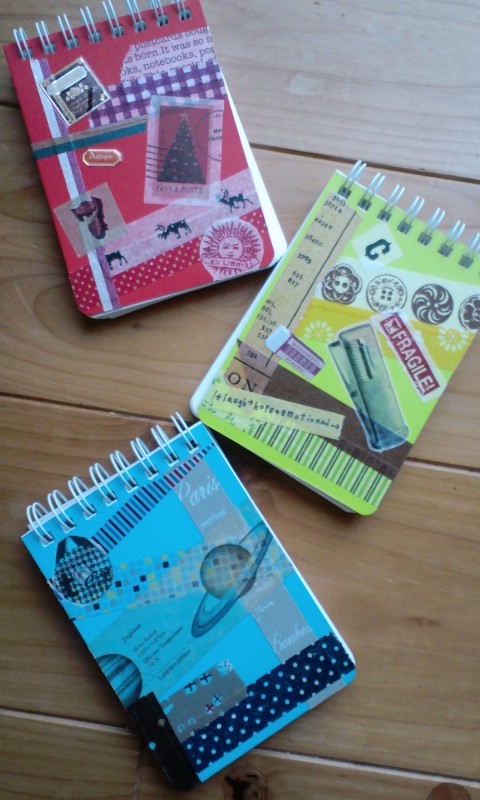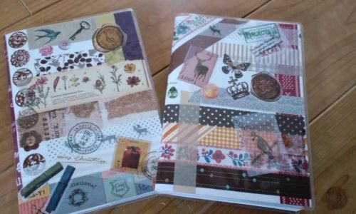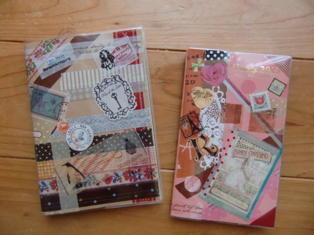 ちょこっと初めてみたコラージュ手帳。 これ相当作るのが楽しいですo(≧▽≦¨)oo(¨≧▽≦)oイベントに出そうと思って作ってはいるもののもし売れ残ったら お友だちにプレゼントしよう と思うとなんかこう 張り切っちゃいます♪追加で作ったのは こちら。左のは ベースをクラフト紙にしてみました。これもいいですね~。右のは 市販されているベースのピンクをそのままいかして。ややスモーキーなピンクなので 落ち着いてて かなり好みです!裏側もいいのですよ。こちら。クラフトのは ラッキーモチーフのマステを張っております。いいことあるかも♪それから ちょっとだけ和風にもチャレンジ。こっちが裏。えっ どこが?和風?!と 突っ込んだあなた・・・( ̄▽ ̄;) (←うちの娘です!)そこはまぁなんちゃって 和風っていうことで。(ええ背景が和風の千代紙だ っていうだけです、それだけですぅ(>_