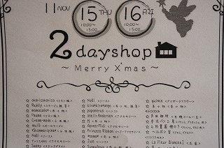 いよいよあと1週間ちょっとと近づいてきました 今回で6回目となる2DAYS SHOP おうちCAFE Azukiさんのイベントです。私も ちょこっと出品します。えと。 メインは 駐車場の誘導係です(笑)おしゃれな ハンドメイドイベントなのにベンチコートきて スポーティーなオーライオーライを やってるのが 私ですので見かけたら お気軽にお声かけてくださいネ~(^_-)-☆以下 Azukiさんとこの ブログより 引用です。*****************************本当に毎回毎回たくさんのお客様が足を運んでくださることに感謝です 今回もお客様が心温まる作品に出会えることを願ってます 11月15(木).16日(金)OPEN 10:00 ~ 15:00 皆さんのお越しをおまちしております****************************(*^_^*)ワタクシも お待ちしておりまする~ 素敵なイベですよ ぜひぜひ。にほんブログ村にほんブログ村ランキング参加中。ぜひぜひポチっとよろしく♪