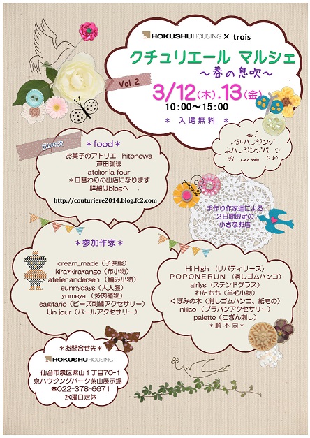 クチュリエールマルシェのお知らせブログはこちらです。↑3月12日、13日 紫山ハウジング 北洲展示場で 行われます。お声をかけていただきました。お花のはんこを出したいな~と思っています。お時間あるかた お手にとってみてくださいませ♪