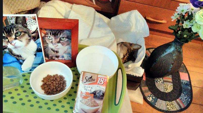 取り急ぎ、簡単な祭壇を作り遺影とお花とお水と御飯を供えた