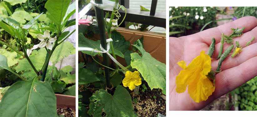 カラフルピーマンと胡瓜の花            摘芯したちびっ子胡瓜