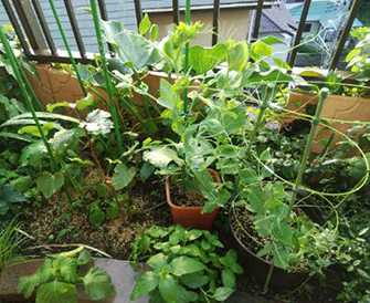 オクラとスナップエンドウコーナー 手前は種が飛んだ大葉
