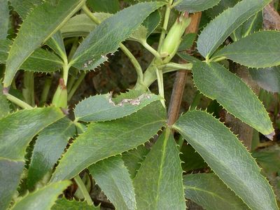 お詫びです先ほど一度登録した記事を 訂正させていただきました。不確かなこと、間違った部分がありましたことをお許しくださいませ。毎年株元から新芽がのびはじめていたクリスマスローズのアグチフォリウスですが今年はえらく株元がさびしい。。。この種は背丈も60~70センチほどの大型のクリスマスローズです。ライトグリーンのカップ状の花が房状になって咲きます。今期は今のところ株元に新芽らしいものが見当たらず新年の花は見送りかしら・・・と思っていました。午前中の庭のオソージで発見!!今年の春から伸びた株の先に新芽らしきものがついています。新芽のついている株の高さは30~40センチというところですこれってそのまま花芽になるのでしょうか??それともここから茎が伸びてその先に花芽がつくのでしょうか??今まで私はこのクリローも小さなクリローと同様に年明けのころから伸びた茎の先に、その春のうちに花が咲くと思い込んでいたのですが・・・・クリスマスローズは大きく2つのタイプがあります。1・無茎種といって花茎を土際から伸ばして花が咲く種類2・有茎種といって茎を伸ばしてその先に花が咲く種類今日の記事のアグチフォリウスは 2の有茎種でした。つまり写真中の葉先の新芽から花が咲いていくわけですね。wildchabyさん ご指摘いただきましてありがとうございました。これからこの新芽の成長を見ていきたいと思います。先ほどの記事を読まれて驚かれたかたがたくさんおられることと思います。 まことに ごめんなさーい