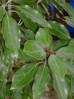 今日の午前の記事の私の問いかけに snowrun29さんがさっそく教えてくださいました。 今日もありがとうございます♪カクレミノであっているようですね。先に検索したときには見つけられなかったのはどうして???ミノカクレ とかミノカサで探したのかもしれませんおさがわせしてすみません。でもおかげさまで、すっきりしました。snowrun29さんのコメントを一部引用させていただきますね。私の持ってる「葉で見分ける樹木」(小学館)のカクレミノのページには「常緑樹で「分裂葉」をもつのは非常に少なく 本州産の樹木に限れば 全縁(葉の縁にギザギザがない)のものは 本種とつる性のキヅタ、 鋸歯縁(葉の縁にギザギザがある)はヤツデ位だろう。 本種は3裂する葉が特徴的だが、 2~5裂する葉や、裂けない葉もしばしば混じり 樹高5mを越えるような成木では殆んどが裂けない葉が多く 反対に幼木では切れ込みが特に深い葉が多く しばしば鋸歯も出る」とあります。芽生えたばかりの幼苗には切れ込みがなく、若木のうちは手のひらのように分裂した葉ができ、もっと成長するにつれて、切れ込みが浅くなり全縁のものと混在するようになると書いてあるサイトさんもありました。ウチの古いほうのカクレミノの葉っぱは2裂のもの以外は今ざっと見た限り見つかりませんが木が古く大きくなっているので通常の分裂していない葉っぱが多いのでしょう。植え替えをした若木のほうは葉の大きさや、色、葉のつき方がまちまちで古い木と別の種なのか、木が若さゆえ~♪ 大人の木と違うのかな~??よくわかりません。若木のようす若木の幹から直接出る葉っぱと枝先に出る葉っぱ右側が若木の表(1枚だけの大きな葉は幹から生えた葉っぱです) 左側は古株の表右上が若木の裏(上に同じ)左下は古株の裏大きくなるまで待つのも楽しみかな(^-^)