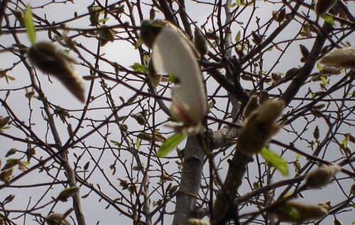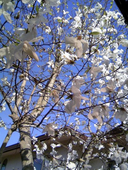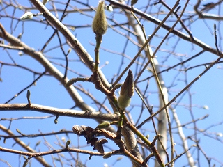 今日は朝から久しぶりの青空。まだまだ小さい新芽だけど、近くで見れば冬の帽子を脱ぎはじめています。木の下には鳥さんの落し物がいっぱいですから、きっと新芽も美味しいのでしょうネこの木の名前は白モクレンだといわれたことがありますが、花と一緒に小さな葉っぱがついていたような、、、ハテこぶしなのかしら~?と毎年思うのですが、いうものごとく花の時期が過ぎると忘れてしまいます今年は開花の写真を撮らねばー!! 小とりさんにいくつかミカンをおいていますが、メジロが時々2羽でやってきます。ガラス越しでうまくデジカメにまだおさまりません。スズメさんに追われるとこも見ましたが、スズメさんはほんのちょっとだけつっついたら、くちばしを何度もぬぐって、飛び去りました。スズメさんはやっぱり穀物でしょう~~