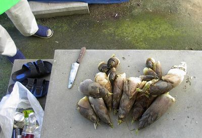 家のすぐ近くにある竹林、このところ暖かさでどんどんたけのこが育ちます。ゴミ拾いをかねてでかけては、年に2,3回ちょっと掘らせていただくのですが ちょっこと見えてる足はワタシ ではありませーん ♪皮をむくととっても少なくなりますが、やわらかくておいしい春の楽しみですね! 感謝感謝 さ~て次は 先日からの謎のキノコですが またまた展開が!!この前は直径2センチくらいだった傘が大きくなったばかりでなく同じキノコが 点、々、と。。。。 まるで 菌の道 でもできているようです。大きさや、色合いはまるでしいたけのよう~でも もちろん食べませんから~!! しばらくそのままになっていたアゲハのサナギたち (虫の苦手な方ごめんなさいね~!!) 去年の秋キンカンでさなぎとなったアゲハくん、3月23日にも途中経過で登場しました 金柑の木をおおっていたポリ袋にあけていた穴からいつの間にやら、脱出!せめて一目なりともチョウとなった姿を見たかったのですが、、、、「もぬけのから! 」となったさなぎ、植木鉢のふち、中央の下、、 つめたいぞ~! 殻を見つけたおかあさんは寂しかったんだぞ~!! あともう一匹はジョウロの取っ手にぶら下がっていたので、救急のお手当てをしています。snowrun29さん アドバイスどうもありがとうございました^0^*)/ ずーっと 羽化待ち なんですヨ。。。 ミカンの赤いネットで逃げないように覆っていますが、もうそろそろチョウになってもいいんだけどな~~ のんびり屋さんだなあ~ そして 今日のはてな~??の続き これで最後ですが名前のわからなかった前回の鉢うえチランドシア(パイナップル科)の仲間ということを教えていただきました ガストルキスさん ありがとうございま~す♪開花が進みましたヨ。 かんざしのように プラプラ~と、かわいらしくゆれま~すこの花の名前は「ようらく筒アナナス」(パイナップル科・ビルベルギア属)です。「ようらく」とはお仏壇の上方隅にきらきらした飾り物がさがっていますね。この仏具を「ようらく」というそうです。多分その形、イメージからつけられた名前なのでしょうね
